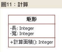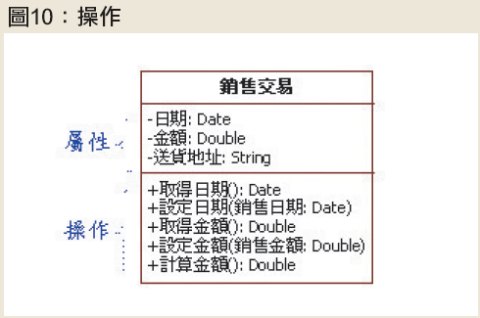 在代表類別的三格矩形中,第一格放置類別名稱,第二格放置屬性,第三格則放置「操作」(operation),也就是物件所提供的服務,如圖10所示。