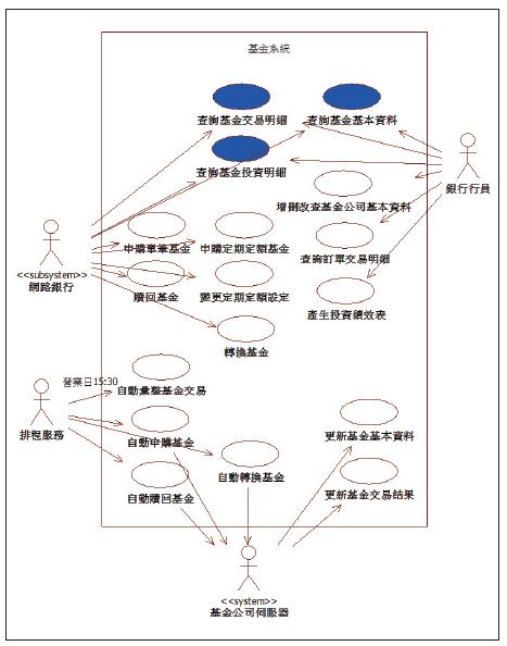 至於,在開始進入衝刺1之際,必備的重要文件就是在衝刺0時所產出的產品待辦清單表1和表2,由於,我們同時採用了UML技術,所以此處也建議你搭配基金系統的使用案例圖,將產品待辦清單視覺化,如圖1所示。