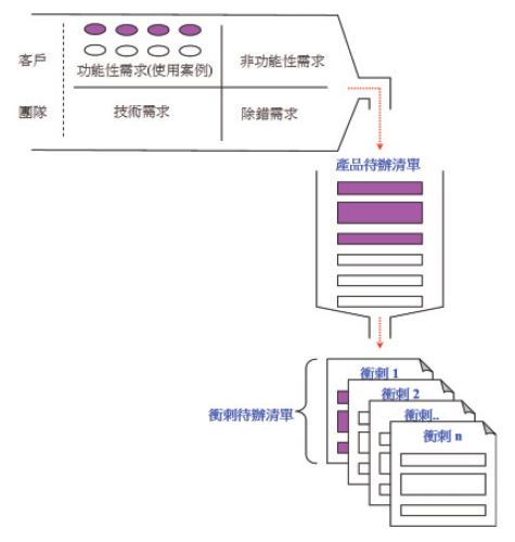 ● 衝刺計畫會議(Sprint Planning Meeting):每個衝刺期間的一開始必須先舉行衝刺計畫會議,主要用來決定該衝刺期間的待辦項目,以及團隊的衝刺任務。