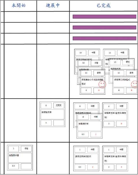 從任務板上可以非常清楚看到,前一天的工作進度非常不理想,系統分析師:卡爾(Karl)和程式設計師:克萊兒(Clair)並未完成原先預定該完成的工作任務。Scrum教練詢問之下才知道,前一天卡爾(Karl)和克萊兒(Clair)兩人被臨時派去支援一項緊急任務。所以,卡爾(Karl)根本沒進度,而克萊兒(Clair)則只完成了一小部分的任務。最後,我們額外列出了任務板中,尚未開始的任務、以及進展一半還未完全完成的任務,如圖3。