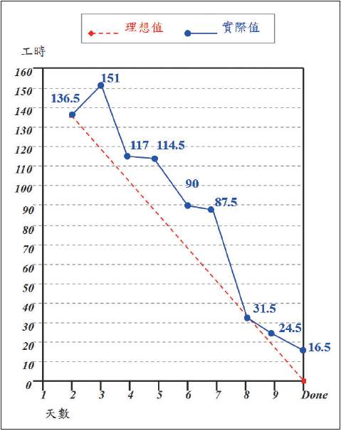 ● 燃盡圖(burndown chart):簡單來說,我們可以繪製燃盡圖,來呈現一個時間區段中,剩餘的工作量。所以,有些文章或書籍中,也將「Burndown Chart」中譯為「剩餘工作圖」或者是「剩餘時間圖」,原因正是如此。