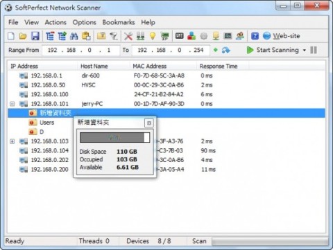 一個網段上會有眾多IP位址,每個IP位址大多都會有分享資料夾,那該如何得知網段上有那些分享的資料夾,雖然可以用net share之類的指令去得知,但是太麻煩了,整個網段不就累死,所以這時就要靠SoftPerfect Network Scanner幫你掃描網段,不過SoftPerfect Network Scanner功能不是這麼簡單,還提供了多種你想不到的功能