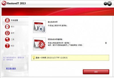 如果沒有輸入啟用序號的話,可以有14天的軟體試用期。程式的主畫面如下,左半邊有主要的功能選單:中央控管、備份、還原、工具及幫助選項…