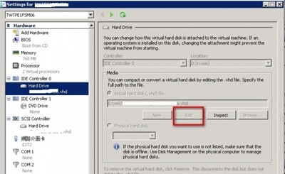 在舊版的Hyper-v如果要在虛擬機器開機狀態中新增硬碟或是擴充硬碟容量是可以達成但是必須是SCSI控制器的虛擬硬碟才可以,但是如果要修改系統磁碟就必須要關機狀態才行。下圖可以看到開機狀態是無法編輯IDE 控制器的虛擬硬碟…