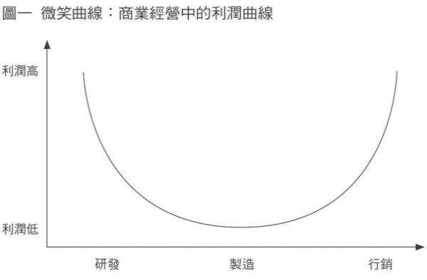 宏碁施振榮先生的「微笑曲線」是大家所熟悉的(見圖一),大意是在商業經營中,利潤最高的落在上游的研發以及下游的行銷兩端。中間的製造則是毛利最低的商業活動。品牌經營正是行銷活動的主軸,也是微笑曲線右端的利潤來源。