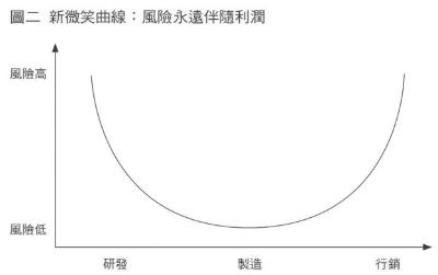 追根究底,品牌經營的成果固然有其美好的一面,品牌的經營過程,卻有更多不為人知的風險。簡單來說,微笑曲線不只適用在利潤層面,也適用在經營風險的描述上(見圖二)。換言之,研發與行銷的利潤比製造大,但其風險也比較高;製造這一塊的利潤雖低,但風險也低。