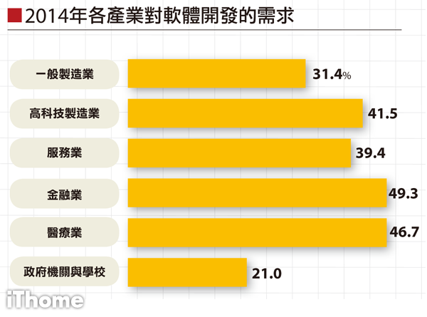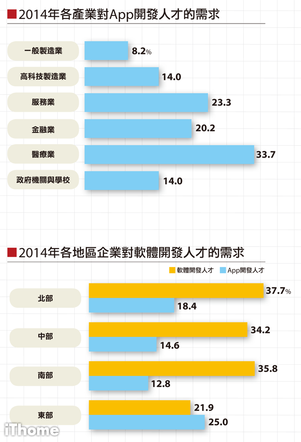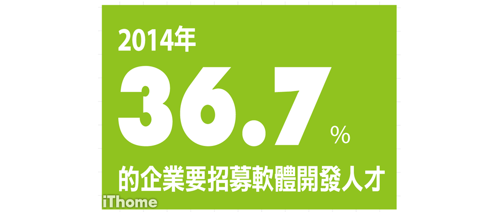 根據iThome 2014年IT工作與薪資大調查,在2014年最搶手的IT職缺,莫過於軟體開發人才。超過36.7%的企業要招募開發人員,其中以金融業(49.3%)和醫療業(46.7%)的需求力道最強,高科技製造業和服務也有近4成企業要招募開發人才,遠高於一般製造業的31.4%。以地理分布來看,北、中、南各地的職缺機會相當,都有超過3成企業開缺,遠高於東部的2成多。
