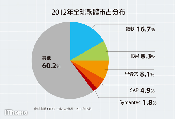 在市占排名上,微軟以17.8%居2013年全球軟體市占率之冠,接著是IBM的8%、甲骨文的7.9%、SAP的4.9%,和Symantec的1.7%。