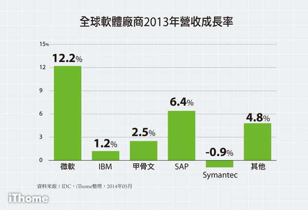 這五家全球市占前五名的軟體大廠,在營收成長率上,微軟以12.2%居2013年全球軟體營收成長率之首。IBM的營收成長率為1.2%、甲骨文則是2.5%、SAP營收成長率為6.4%,Symantec則是-0.9%。