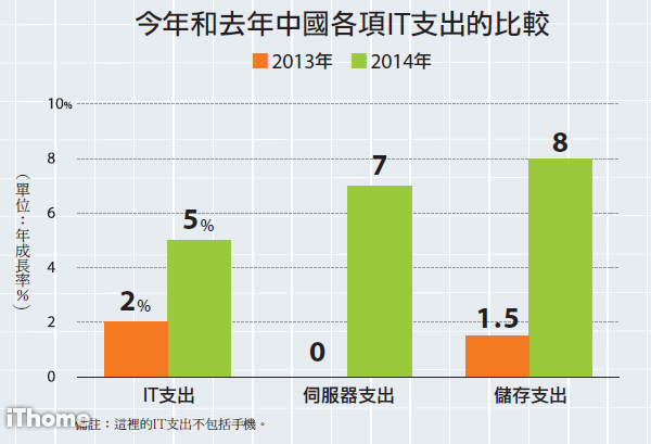 2013年的經濟衰退,對中國的IT支出有負面影響,但這也創造出一股顯著受壓抑的IT需求,將驅動科技投資的改善。中國IT支出的成長,在去年放緩至8%,但在2014年會有13%的成長。