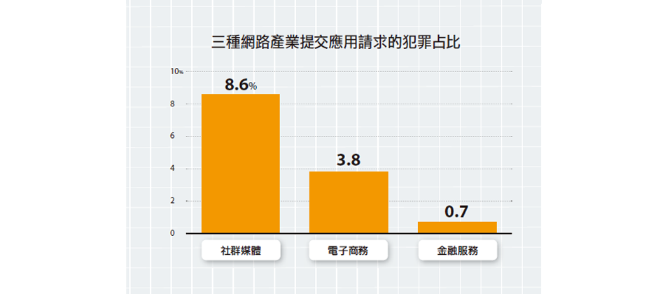 根據報告指出,在以金融服務、電子商務和社群媒體三種網路產業的提交應用請求做為分析對象時,結果顯示以提供社群網路、內容串流與線上約會服務為主的社群媒體,在從事網路提交應用請求時,近1成(8.6%)比例是網路犯罪攻擊的請求動作,比例占3種產業中最高。其次在分析電子商務的應用請求時,也顯示有3.8%提交應用請求是網路犯罪攻擊,即便是在安全保護極為嚴苛的金融交易上,仍發現有0.7%的應用請求是網路犯罪攻擊的活動。