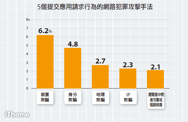 ThreatMetrix也揭露出主要5個針對提交應用請求的網路犯罪攻擊手法,分別是裝置欺騙(Device Spoofing)、身份欺騙(Identity Spoofing)、地理欺騙(Geographic Spoofing)、IP欺騙(IP Spoofing),以及瀏覽器中間者攻擊或殭屍病毒(Man-in-The-Browser或Bot)。而當中又以採用「裝置欺騙」的網路攻擊手法居多,占總應用請求行為的6.2%。這些採用裝置欺騙的犯罪手法,多是透過駭客自行變更或刪除瀏覽器的設定,從而改變裝置的識別身分或指紋,以此來達到網路犯罪的欺騙目的。