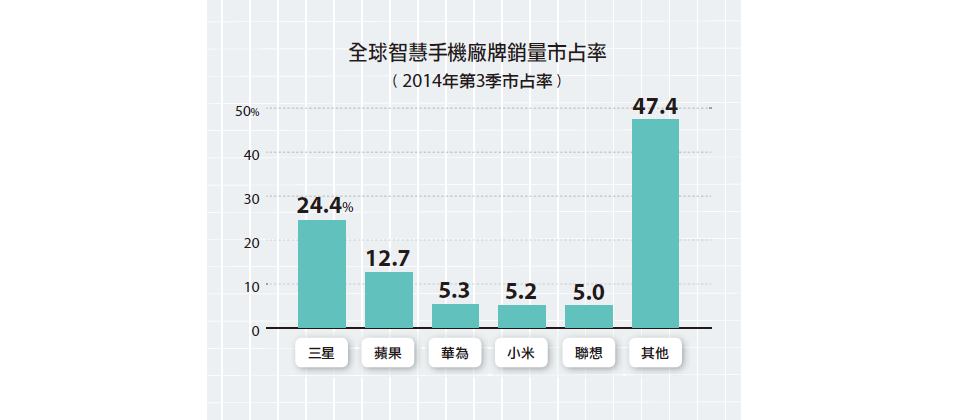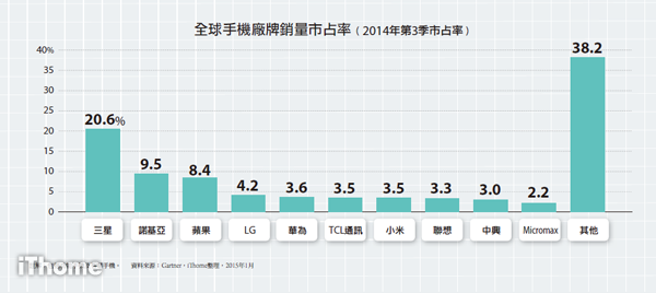 在智慧手機的部分,三星以24.4%為最高市占率,相較前一年同期下滑了7.7%,蘋果市占則有些微成長,位居第二大市占廠牌,這兩大智慧手機廠牌市占合計為37%,較前一年同期下滑了7%。Gartner指出,三星的功能手機與智慧手機銷售量在2014年第三季皆下滑,其中,功能手機較前一年同期減少10.8%。另外,三星最主要的中國市場下滑了28.6%,在西歐及亞洲地區的需求成長力道薄弱。