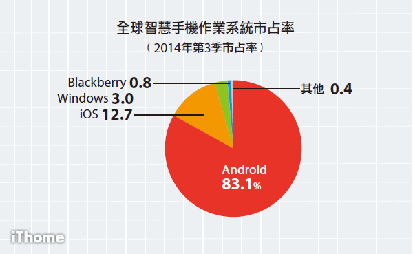 從各區域來看,新興市場成長較為顯著,其中東歐、中東及非洲地區在2014年第三季的智慧手機銷售量較前一年同期成長近50%,成長率最高,成熟市場中則以美國的18.9%成長率為最高,主要原因來自於iPhones 6和6 Plus的上市。在智慧手機的作業系統方面,Android及iOS皆持續成長,市占率分別為為83.1%、12.7%,Windows、Blackberry兩者市占率則分別滑落至3%、0.8%。
