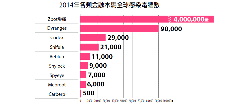 2014年威脅全球最嚴重的金融木馬是Zbot變種金融木馬,從2013年全球有200萬臺電腦被感染,到2014年全球有400萬臺電腦被感染。另外,賽門鐵克指出,2014年感染Cridex的電腦數量比2013年減少88%,感染Spyeye的電腦數量減少87%;金融木馬始祖Zeus(Trojan.Zbot)及其變種程式感染的電腦數量,從2012年~2014年增加了10 倍;其他變種木馬和分支,例如:Citadel,仍是金融木馬感染次數大宗,2014年感染了29,000臺電腦。