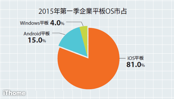 根據該報告指出,2015年第一季蘋果iOS平臺仍是企業選購行動裝置的首選,儘管相較於去年第4季小幅下滑1%,但仍維持超過7成(72%)的企業採用。