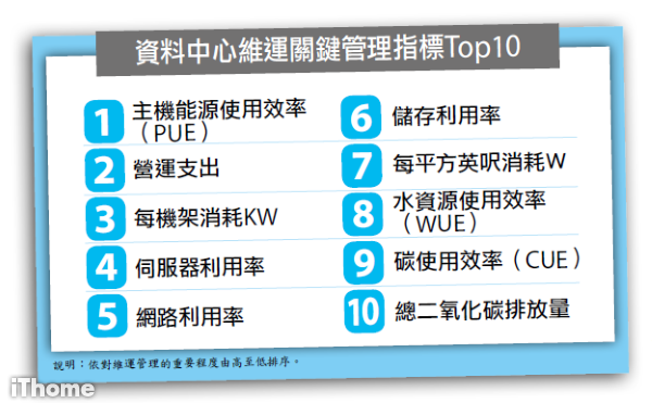在管理指標上,資料中心維運管理者最重視的機房管理指標是主機能源使用效率(PUE值),其次是營運支出,以及平均每一機架消耗功率(KW),也是管理者重視的Top3項目。