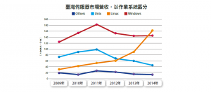 IDC 2014年臺灣伺服器市場研究報告:Linux作業系統在2014年市占首度超越Windows作業系統,營收破1億6千萬美元,搶下超過4成市占率