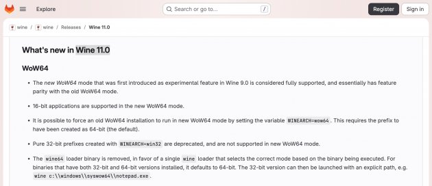 Wine 11.0的新WoW64架構可執行16位元程式,並以64位元前綴(Prefix)作為預設方向。同步機制方面加入NTSYNC,搭配Linux 6.14提供的核心模組,能提升多執行緒同步效能
