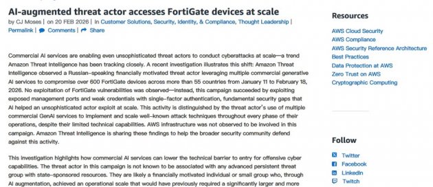 Amazon提出警告,以財務動機的俄羅斯駭客團體濫用生成式AI,在5個星期的時間裡對全球超過600臺FortiGate防火牆發動大規模攻擊,範圍遍布55個國家。而這些駭客鎖定的目標,是使用弱密碼、未採用多因素驗證,以及曝露管理連接埠的設備下手