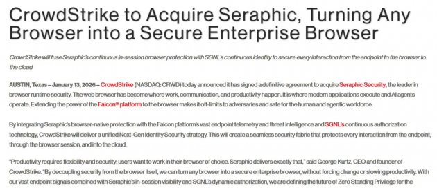 繼買下身分安全即時授權新創SGNL後,資安公司CrowdStrike宣布再併購瀏覽器新創Seraphic,他們將藉由兩家公司的技術來強化Falcon平臺的能力,打造無縫的安全架構
