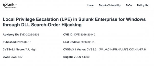 Splunk Enterprise Windows版存在DLL搜尋順序劫持漏洞CVE-2026-20140,低權限使用者若能在安裝磁碟建立目錄並植入惡意DLL,可能在Splunk服務啟動載入,並於實例重啟時以SYSTEM權限執行,形成本機提權風險