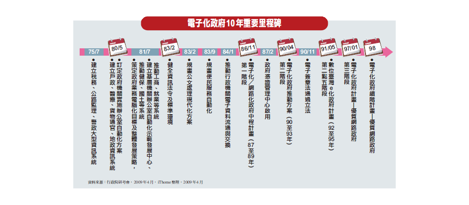 資料來源:行政院研考會95年度「我國電子化政府之影響評估」委託研究計畫,iThome,2009 年4 月 |