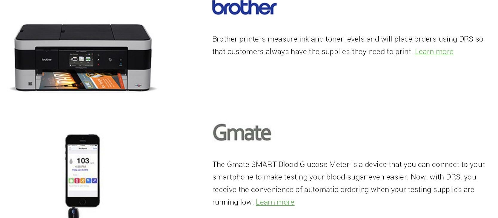 新推出的智慧家電則無需任何按鍵或裝置,只要加入並啟用服務,機器就會自己補充洗衣粉、印表機墨水及血糖試紙等。第一批上線的裝置包括一款GE洗衣機、特定45 款Brothers印表機及Gmate智慧型血糖計。Brothers印表機用戶現在就可以啟用Dash補給服務,而支援的GE洗衣機及Gmate血糖計用戶本月底即可啟用該服務,且無需新購產品。