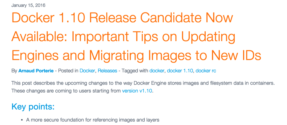 Docker資深工程主管Arnaud Porterie表示,Docker Engine 1.10版本將完全改變Docker Engine在本機儲存映像檔的方式。過去的映像檔都是隨機指派通用唯一辨識碼(UUID)進行命名,而新版本透過則安全雜湊(secure hash)的機制,Docker得以透過映像檔的內容,為映像檔進行ID編號。(詳全文)