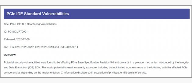 PCIe標準的完整性與資料加密(IDE)安全機制存在3項資安漏洞,PCI-SIG修訂相關規格進行修補