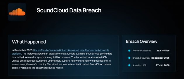 音樂串流平臺SoundCloud儀表板出現未授權活動,HIBP估計受影響帳號約2,980萬筆,外洩約3,000萬個唯一電子郵件地址,目前未發現涉及密碼或財務資料