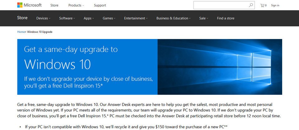 根據微軟官網,每位用戶可以攜帶1臺符合Windows 10升級條件的電腦至微軟零售店,微軟零售店的技術人員可以提供升級Windows 10的免費服務,只要用戶在當地時間的中午12點前進入微軟零售店請技術人員協助升級電腦,且技術人員在當天營業時間結束前無法成功升級用戶該臺符合Windows 10升級條件的電腦,微軟將會免費贈送一臺Dell Inspiron 15的筆記型電腦。