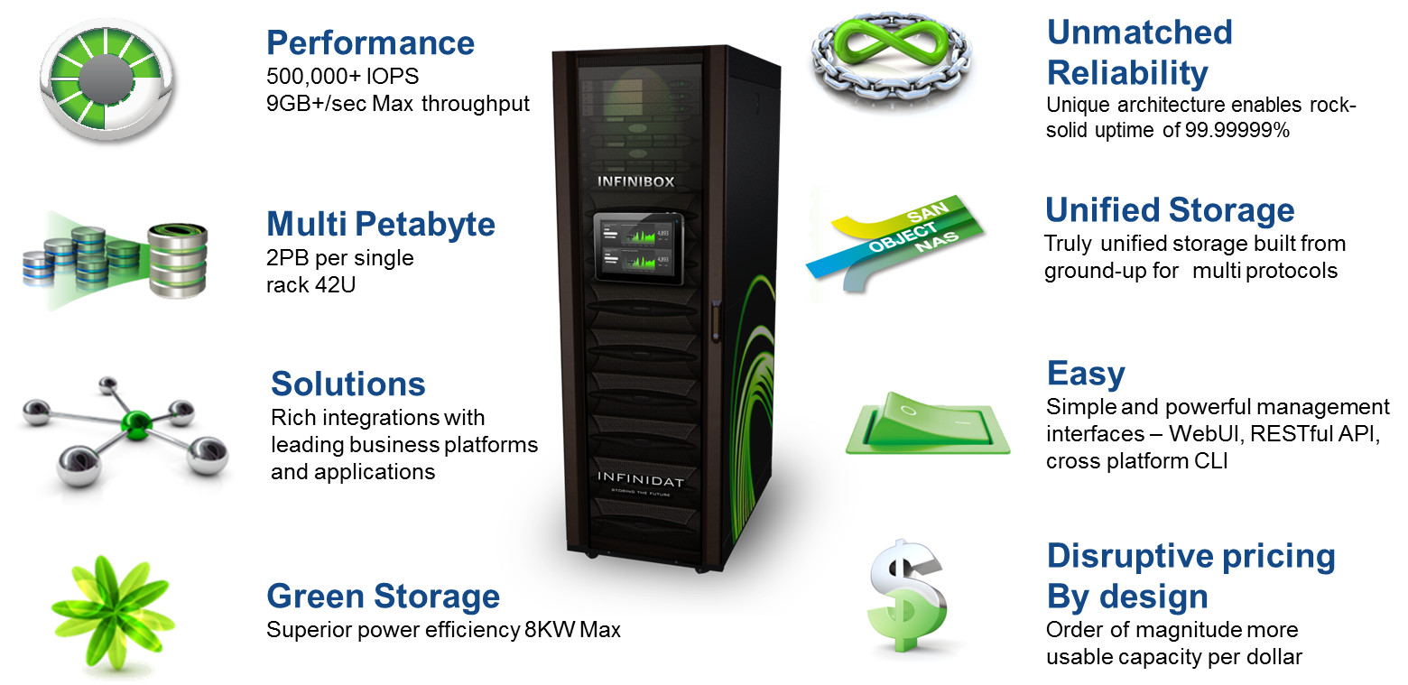 Infinidat是2011年成立的新創廠商,總部位於以色列,VMworld 2014大會上展出旗下第一款高階儲存產品InfiniBox,是兼具區塊儲存、檔案儲存與物件儲存三合一功能的通用型產品。