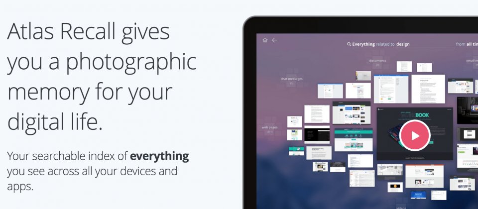 Atlas Recall目前只有支援macOS及iOS的版本,之後亦將支援Windows 10。這是一個可於背景運作的程式,它會記錄使用者在裝置上與之互動的所有內容,從文件、網頁、電子郵件到聊天訊息等,然後將它們儲存在雲端上,使用者則可以根據檔案類別、期間或關鍵字進行搜尋與篩選。