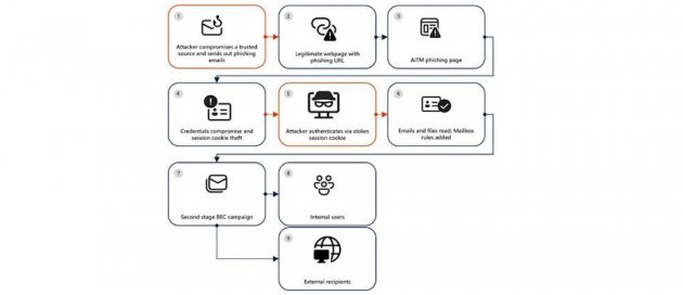 最新一波對手中間人攻擊(AiTM)與商業郵件詐騙(BEC)瞄準能源產業而來,揭露此事的微軟指出,駭客事先滲透其他組織可信的電子郵件帳號,然後發送看似正常的SharePoint連結,來啟動整個攻擊鏈
