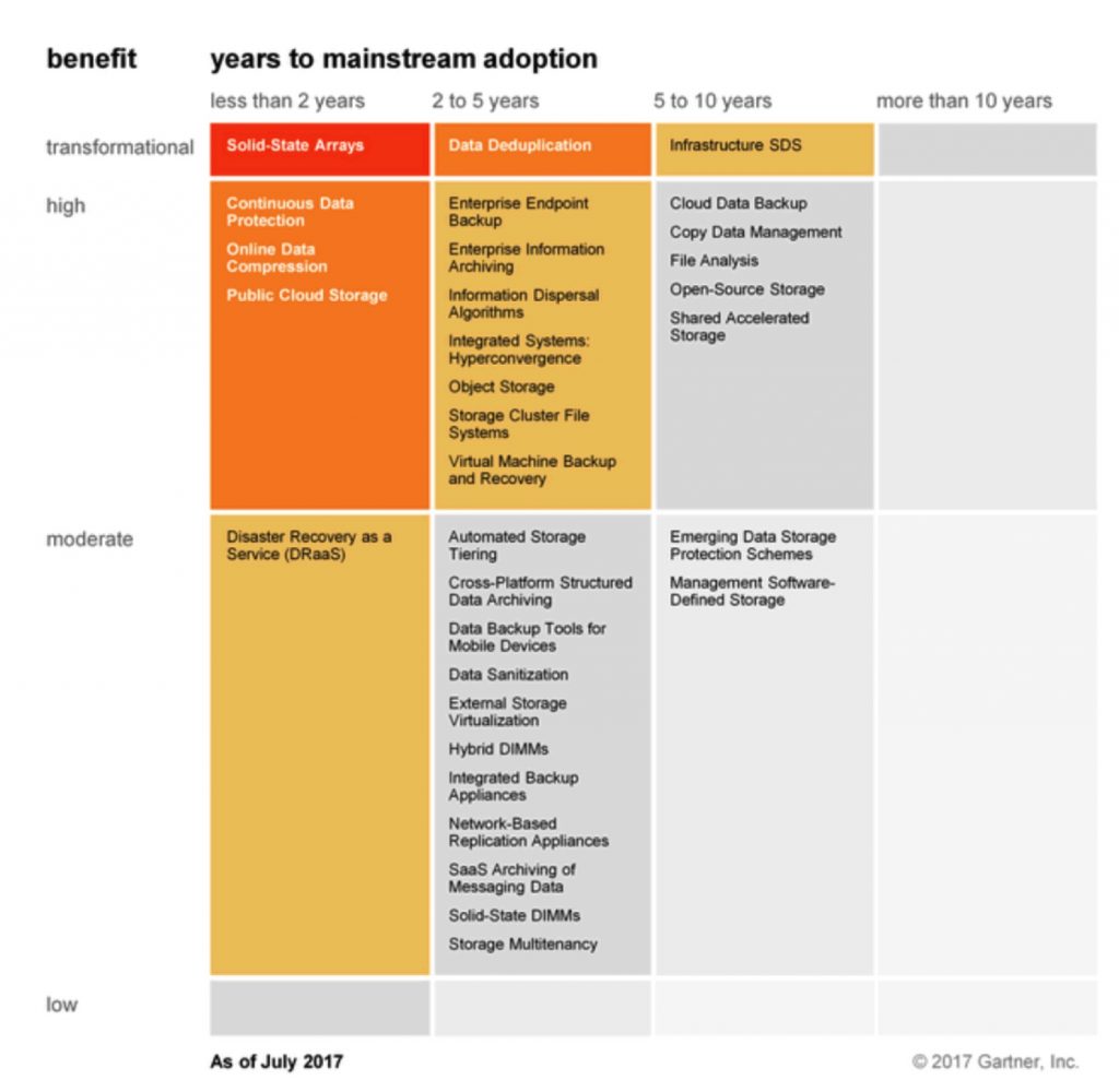 以2017年來說,會在2年以內進入主流,並造成重大變革的技術只有固態儲存陣列,高影響力技術則有連續資料保護、線上資料壓縮與公有雲儲存。