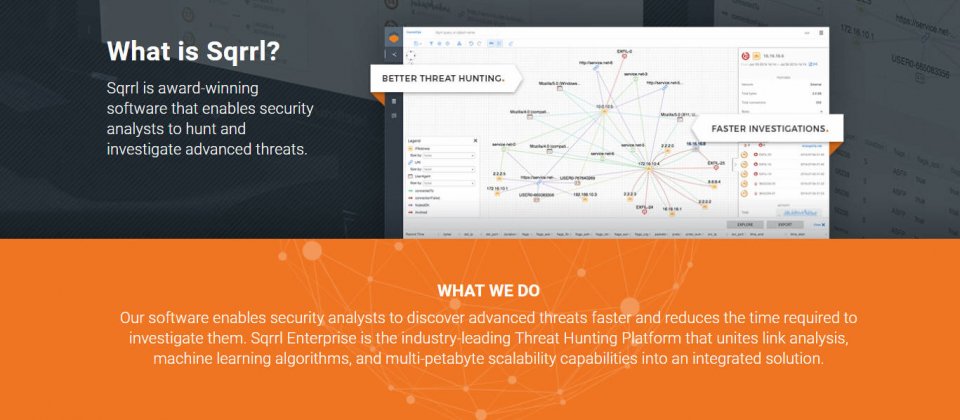 Sqrrl的主要產品為威脅狩獵平臺(Threat Hunting Platform),透過連結分析以及使用者行為分析,整合使用者、實體、資產以及事件資料,造出行為圖(Behavior Graph),讓使用者瀏覽並應對安全意外。威脅狩獵平臺主要依賴開源專案NoSQL資料庫Apache Accumulo,Accumulo於2008年開始開發,2011開源,而Sqrrl在2012年創立,Accumulo現為使用者第3多NoSQL資料庫。