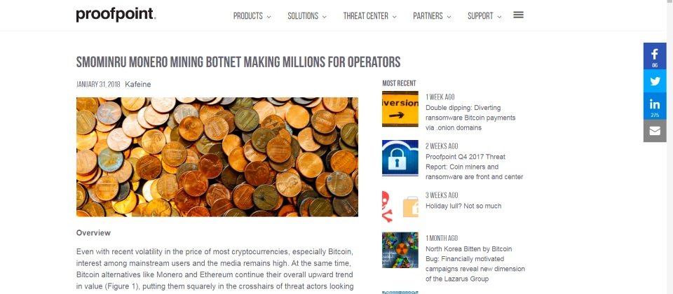 又有挖礦程式企圖利用Windows伺服器。資安業者Proofpoint發現名為Smominru的殭屍網路程式感染超過50萬臺連網微軟伺服器,利用它們來挖門羅幣(Monero幣)。而臺灣則名列三大節點集中區。(詳全文)