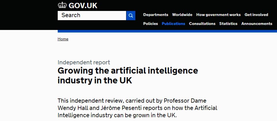 英國政府去年10月在官網發布了一份《英國產業人工智慧發展報告》,找來英國知名電腦科學家Wendy Hall,要找出英國發展AI戰略的解方。(圖片來源/英國政府)