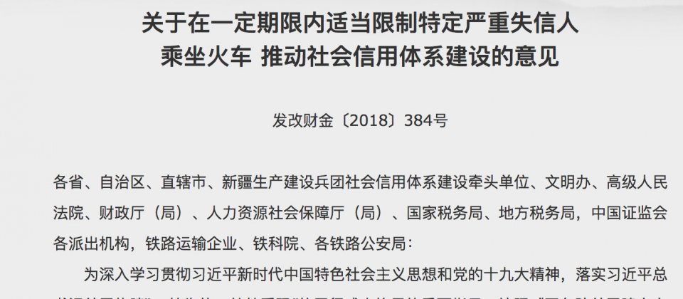 中國國家發展及改革委員會近日宣布,為了推動社會信用體系,自今年5月1起,將禁止嚴重的失信者搭乘火車及飛機,包括那些曾偽造車票、冒用優待身分證件、強佔座位,或者是曾挪用公款、未繳社會保險費的,都會被列入禁搭名單,這意謂著如果你過去做錯了什麼事,可能連大眾運輸都坐不得。