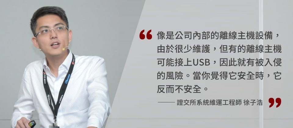 談到實體隔離,證交所系統維運工程師徐子浩提到:「當你覺得它安全時,它反而不安全。」因此,他們也需要更進一步去重視,並落實單位內的離線與周邊主機的安全監控,而不只是單靠防毒軟體與防火牆的防禦,期望進一步藉由入侵偵測系統與合規性的檢測,要讓未來定期系統健檢與維護作業,可以變得更為容易。