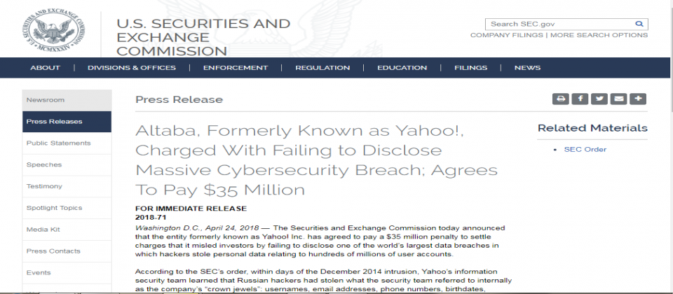 美國證券交易委員會日前發布新聞稿指出,針對前雅虎(2017年6月更名為Altaba)在2014年12月,外洩高達5億筆雅虎會員帳號個資一事,開罰3,500萬美元。該起個資外洩事件,也是當時全球最大的個資外洩事件之一。