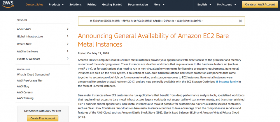 從2006年推出IaaS服務時,AWS許久都未推出裸機運算服務,而這個布局,從2017年底開始轉變,該公司當時宣布,AWS EC2推出了裸機實例運算服務,不過當時僅提供公開預覽版而已,而近日該公司宣佈,現在AWS EC2裸機服務正式上線了。AWS表示,裸機服務適合的應用情境,包含硬體虛擬化技術Intel VT-x,「或是負責支援工作的應用程式,也不需要部署於虛擬化環境中運作。」