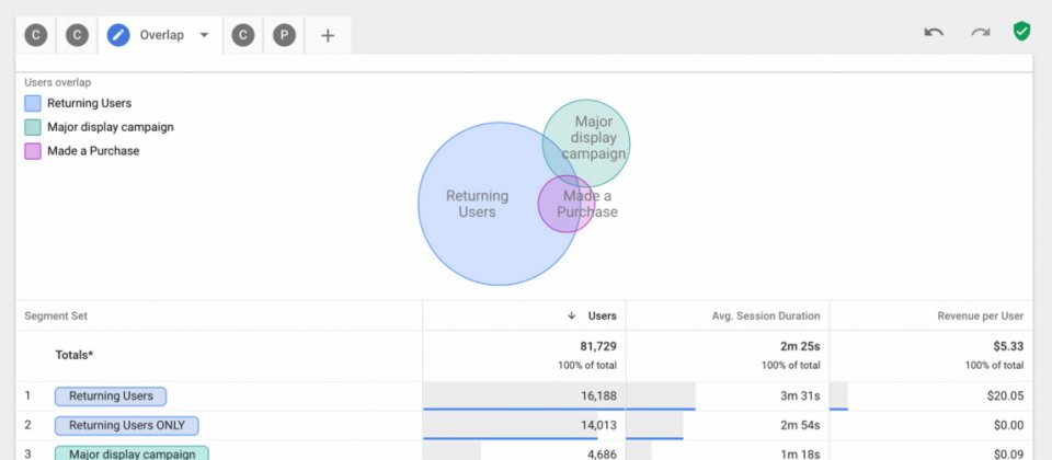 而分群重疊(下圖,來源:Google)則可以讓Analytics 360使用者創建細分受眾的交叉比較狀況。Google舉例其使用情境,廣告主在上個月投放廣告,而這個月多了不少首次購買者,當廣告主想要了解這些顧客是否會回購,這時候分群重疊便能派上用場,比較初次購買、過去一個月內進行購買以及重新訪問網站用戶的重疊情況,便能得到回購族群。