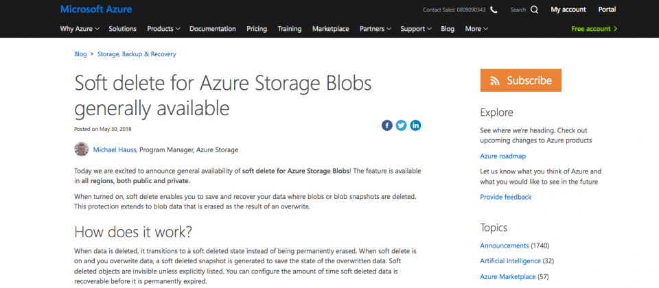 微軟Azure儲存專案經理Michael Hauss也解釋該功能背後的運作機制,當使用者刪除該筆資料後,「它並非被永久刪除,而是先轉換成Soft Delete狀態」,當Soft Delete功能開啟,即使使用者覆寫了資料,系統也會產生一份快照,紀錄被覆寫資料的狀態。此外,使用者也可以設定資料可復原的時間,一旦超過期限,就會變成永久刪除狀態。