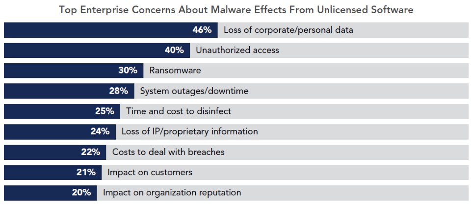 根據商業軟體聯盟2018年度的全球軟體調查報告中指出,企業認為如果使用沒有授權的軟體而受到惡意軟體影響當中,最為擔心的是公司或是個人資料損失,高達46%,其次是非法存取占了40%,但值得留意的是勒索軟體攻擊高居第3位,有3成受訪企業認為是最為嚴重的問題之一,超過系統停機的28%,與處理資料外洩所需花費的22%。