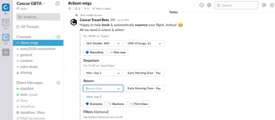 現在使用Concur Travel機器人,企業用戶可以直接在Slack上搜尋機位,並且一起和同事預定機票。這一次釋出的公開預覽版,新推許多方便功能。結合企業用戶與航空公司協議的契約,使用者可以在Slack上搜尋班機,利用航班、機艙等級、航空公司作為過濾條件,不需離開Slack就能完成。此外,如用戶有多人劃位需求,使用SAP Concur Travel聊天機器人,可以直接在公開、私人頻道與同事一同訂票,加快差旅規劃速度。