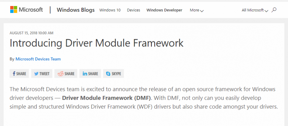 微軟裝置團隊為Windows驅動程式開發人員釋出,開源驅動程式模組框架(Driver Module Framework,DMF),微軟透過驅動程式模組框架,開發簡單和結構化的Windows驅動程式框架(Windows Driver Framework,WDF)驅動程式,並且讓驅動程式之間可以重複使用程式碼,不只加快開發時程,改良後的架構也解決過去單元間複雜的交互作用。
