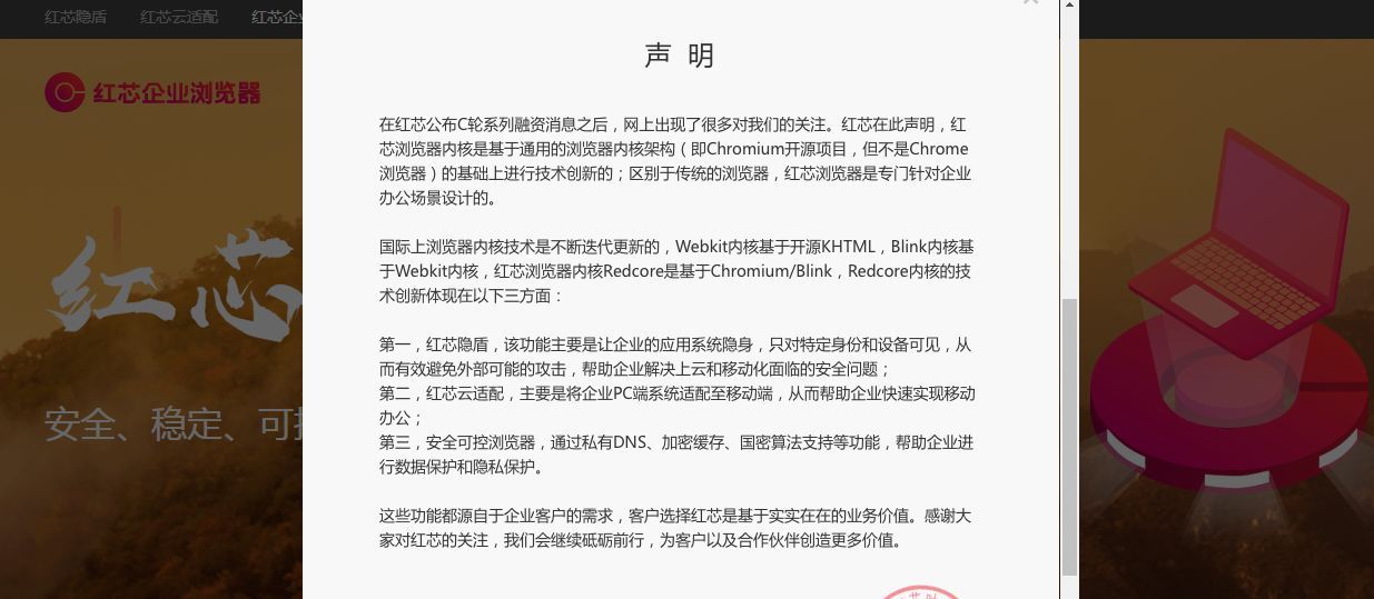 中國科技業者紅芯在上周成為當地最熱門的話題,該公司甫於上周三(8/15)宣布完成2.5億元人民幣的C輪投資,號稱打造了屬於中國人自己的瀏覽器核心Redcore,卻在同一天被踢爆紅芯瀏覽器根本就是山寨版Chrome,隔天(8/16)紅芯即透過官網與微博發表了道歉信,坦承Redcore是基於Chromium而建置,只是在融資的宣傳上誇大了。