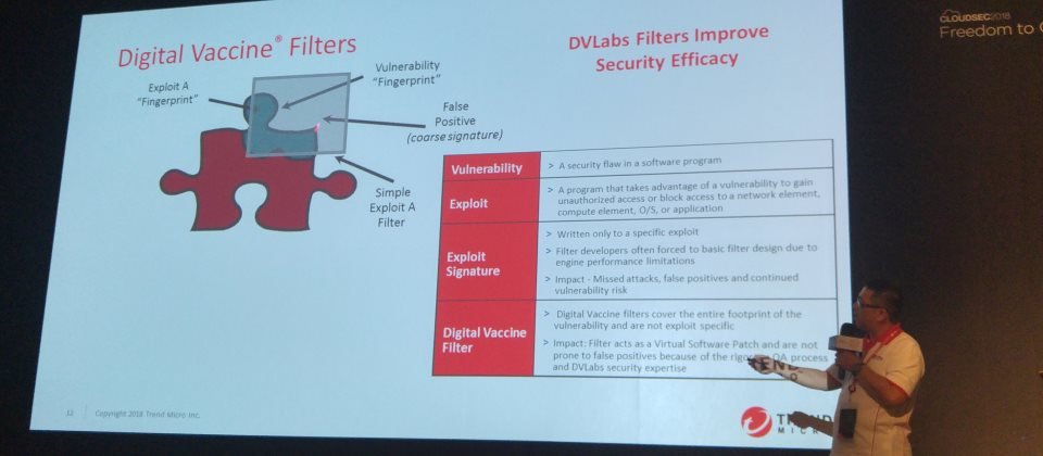 范揚堃以一塊拼圖的形狀,比喻知名的疾風病毒,由於這個蠕蟲後來出現了許多變種,他表示,若是透過標準的軟體弱點修補,便是只有對於所發現的部分樣貌,進行弱點的識別和處理,一旦變種病毒的特徵碼改變,原先的修補作業便不再有效,而需要另行由軟體廠商重新提供修補檔案,再度經由修補流程處理。而實際上,這樣的使用相同漏洞,而出現大量變種的情況,去年的WannaCry等一系列利用永恆之藍(EternalBlue)的攻擊中,在前述的蠕蟲之後,接著出現的Petya也是採用相同的弱點,范揚堃認為,如今這樣的情況仍然相當嚴重。